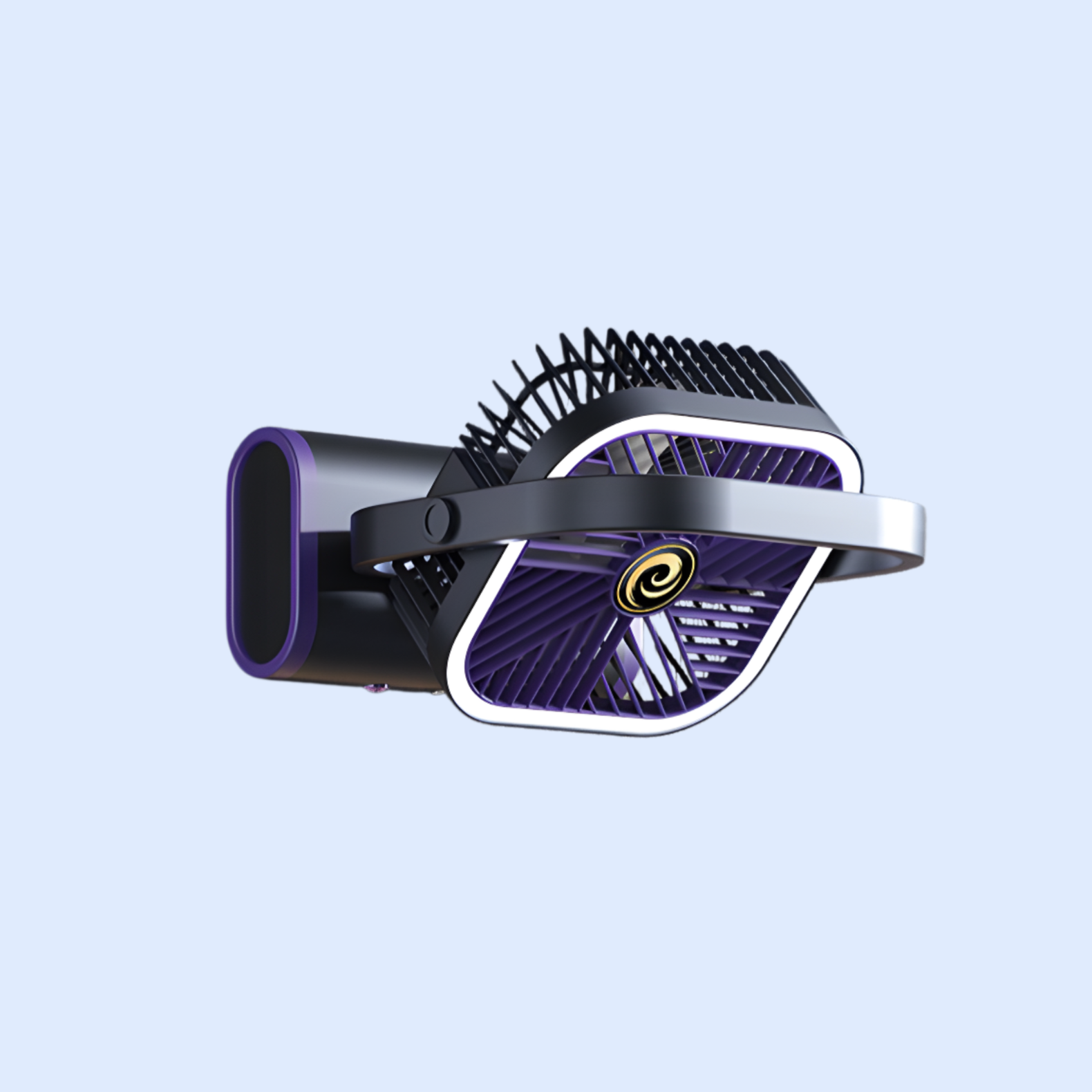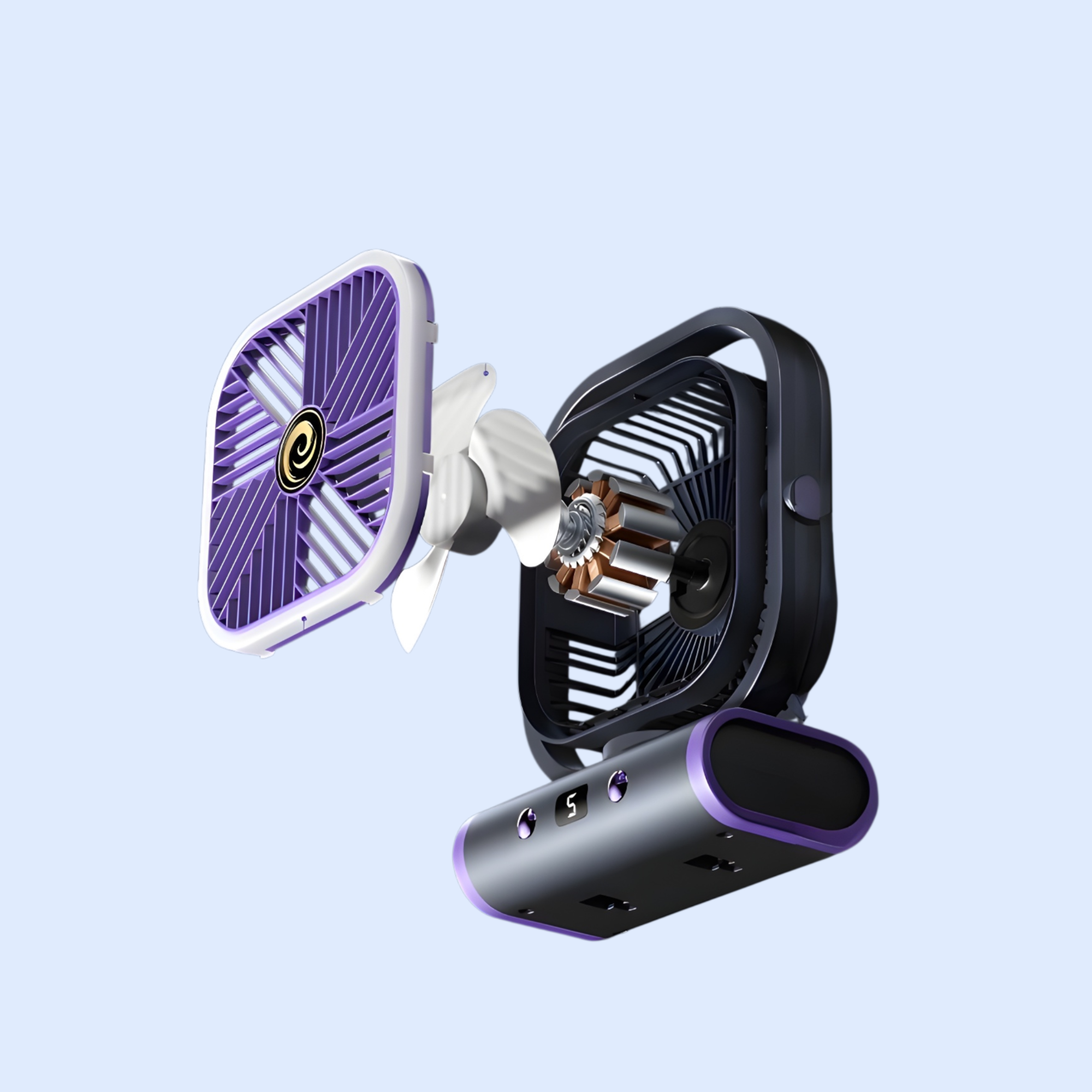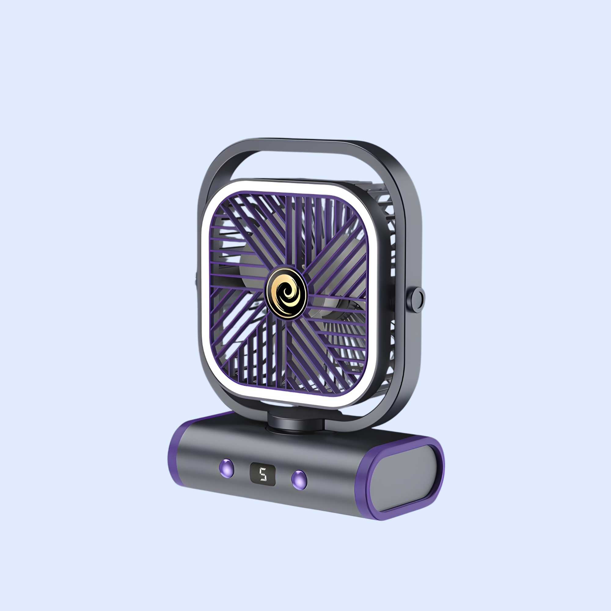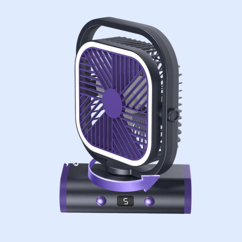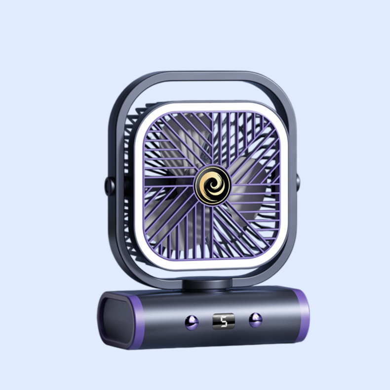 Portable outdoor camping fan night light, USB rechargeable, quiet operation, adjustable brightness, compact design, ideal for tents, hiking, and emergency lighting.